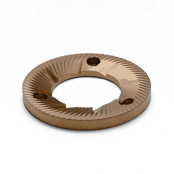The special coating red speed TiAICN Titanium Aluminium carbon Nitride has many advantages on the burr and the ground coffee. This custom geometry burr set is even with a smooth design.Â