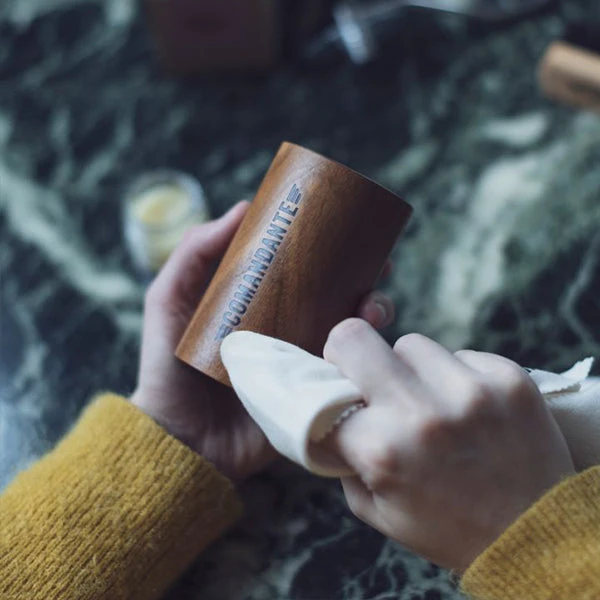 Using the cotton cloth or your fingers, apply the balm to the wooden surface of the grinder. Work the balm into the surface and keep applying until the wood stops absorbing it. Wipe away the excess and let the wood rest before polishing it with the cloth. Use the barista brush to gently clean out and loosen the ground coffee inside the grinder.