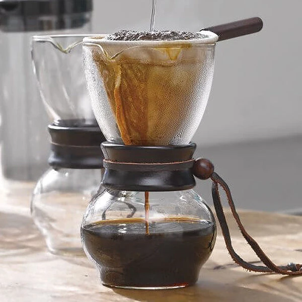 If you’re a fan of cloth coffee filters, the Hario Drip Pot 480ml is your friend. This brewer includes a cloth “sock” filter that’s attached to a metal rod with a handle and a glass carafe for collecting the brewed coffee as it falls.