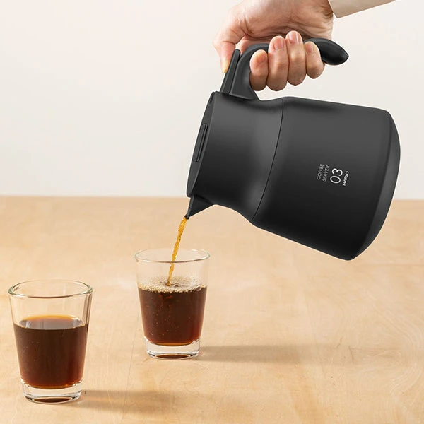 This server is cleverly designed to allow you to use a V60 dripper with and is perfect for those who love freshly brewed coffee but hate having to wait a long time before they can enjoy it. The server keeps the coffee hot, allowing you and your guests to sip at their leisure. To enjoy a cup, simply press down on the lid lip and pour into your favorite mug or cup. Easy, elegant and functional.