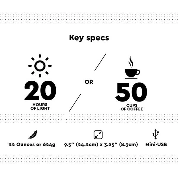 50 Cup Rechargeable Battery – A full charge via Micro-USB gives power for 20 hours of light or 50 coffees.