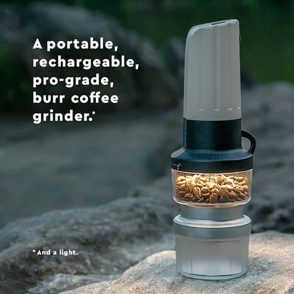 Weighing just 624g and taking up a mere 22.4cm x 8.3cm, the Lume Portable Coffee Grinder is a great piece of gear for travel coffee lovers.