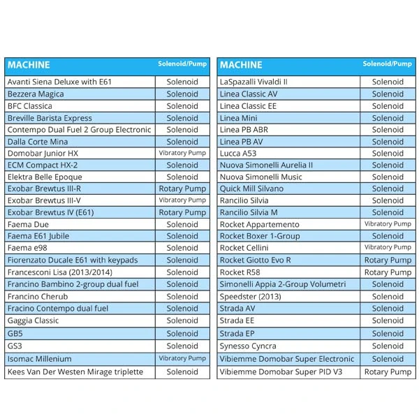 - Quick Mill Silvano, Faema E61 Jubile, Gaggia Classic, Avanti Siena Deluxe with E61, Nuova Simonelli Music, Rancilio Silvia, Dalla Corte Mina