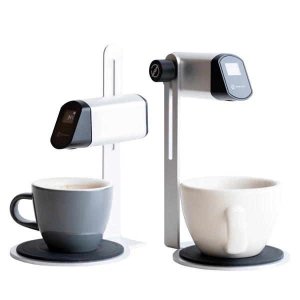 The Nucleus Compass is a hands-free thermometer that allows you to take the temperature of your coffee from a distance, without ever dipping the apparatus into your cup. Thanks to its infrared temperature sensor, you can get accurate readings quickly as the Nucleus Compass hovers over your coffee. It can also be set up on a stand for a completely hands-free operation or be used as a handheld device. Perfect for assessing coffee quality during cuppings and competitions.