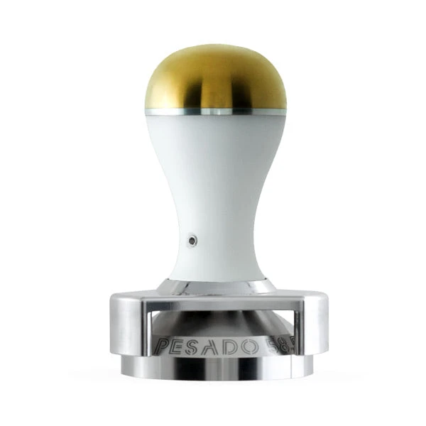 - PESADO 58.5 Metal Tamper – White and Gold – w/ Depth Adjuster