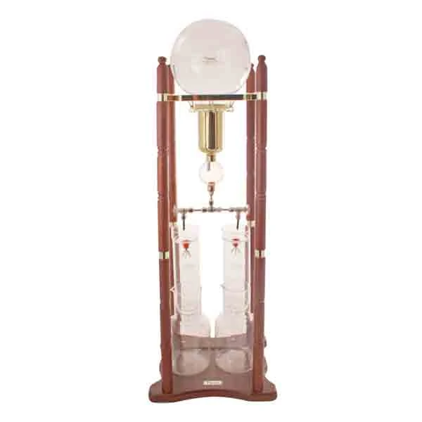 The brewing process isn’t as complicated as the brewer makes it seem. Simply add freshly ground coffee or tea leaves to the brewing chambers, fill the upper chamber with water and ice, and set the brass drippers to allow one drop of water to fall per second.
