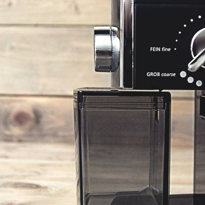 The grinder’s casing is made from plastic and acrylic and is very easy to take apart and clean. The upper grinder disk is removable for a good burr cleaning, the ground catcher is dishwasher safe, and an included cleaning brush gets the job done with ease.